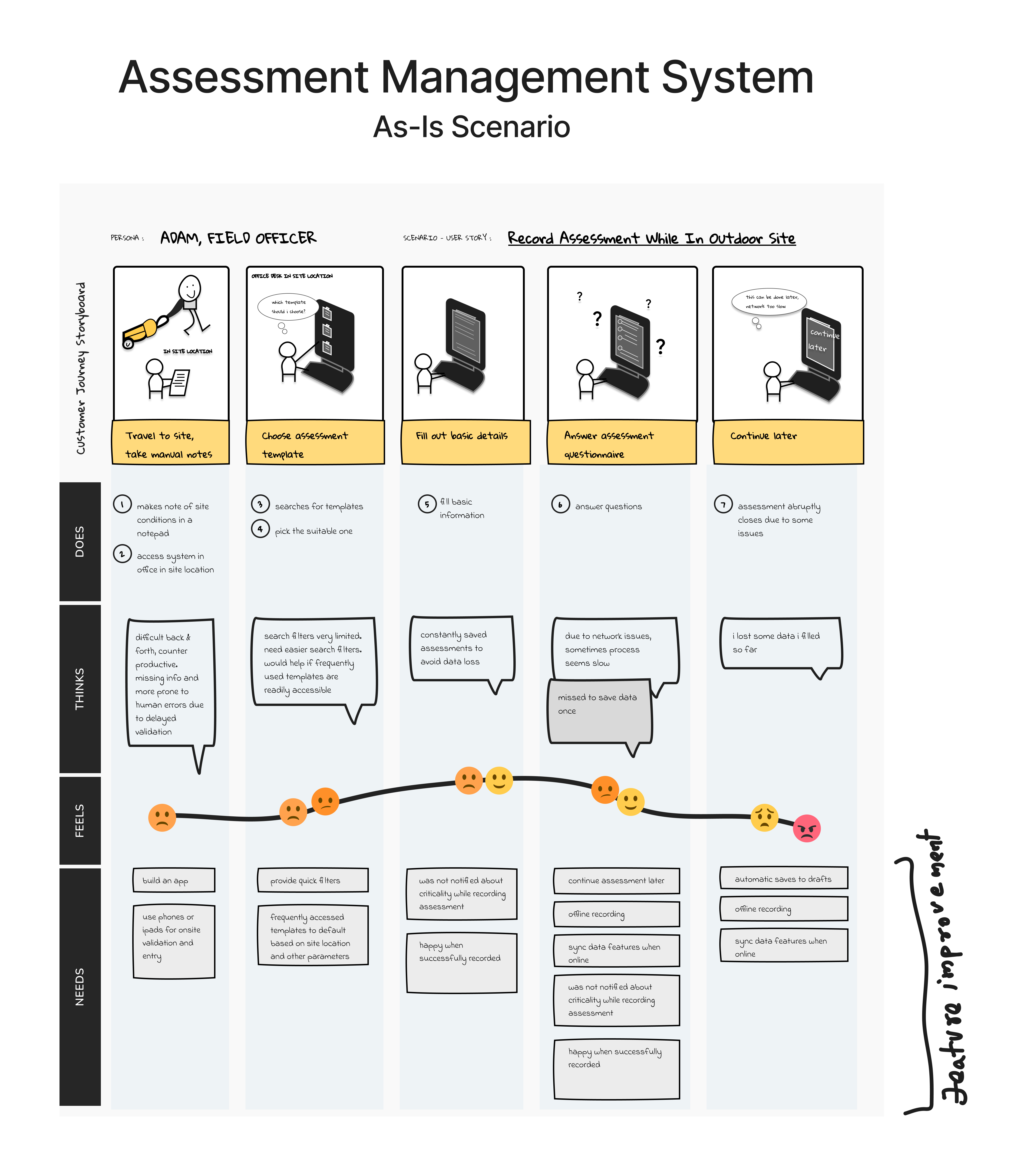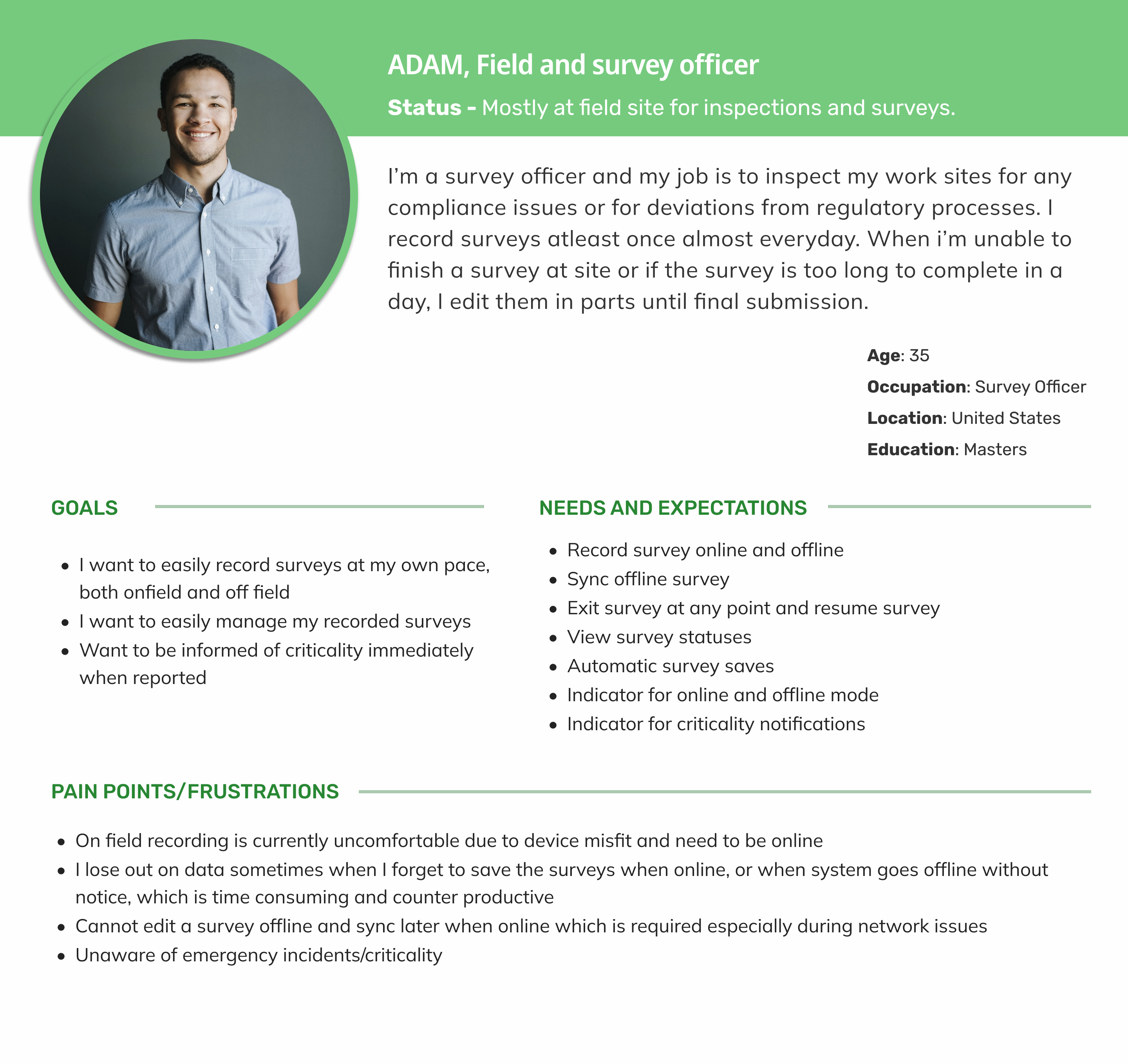 Travel to site, take notes | Uses pen & paper | "Hope I don't lose these notes." | Anxious, cautious | Mobile recording, auto-save |