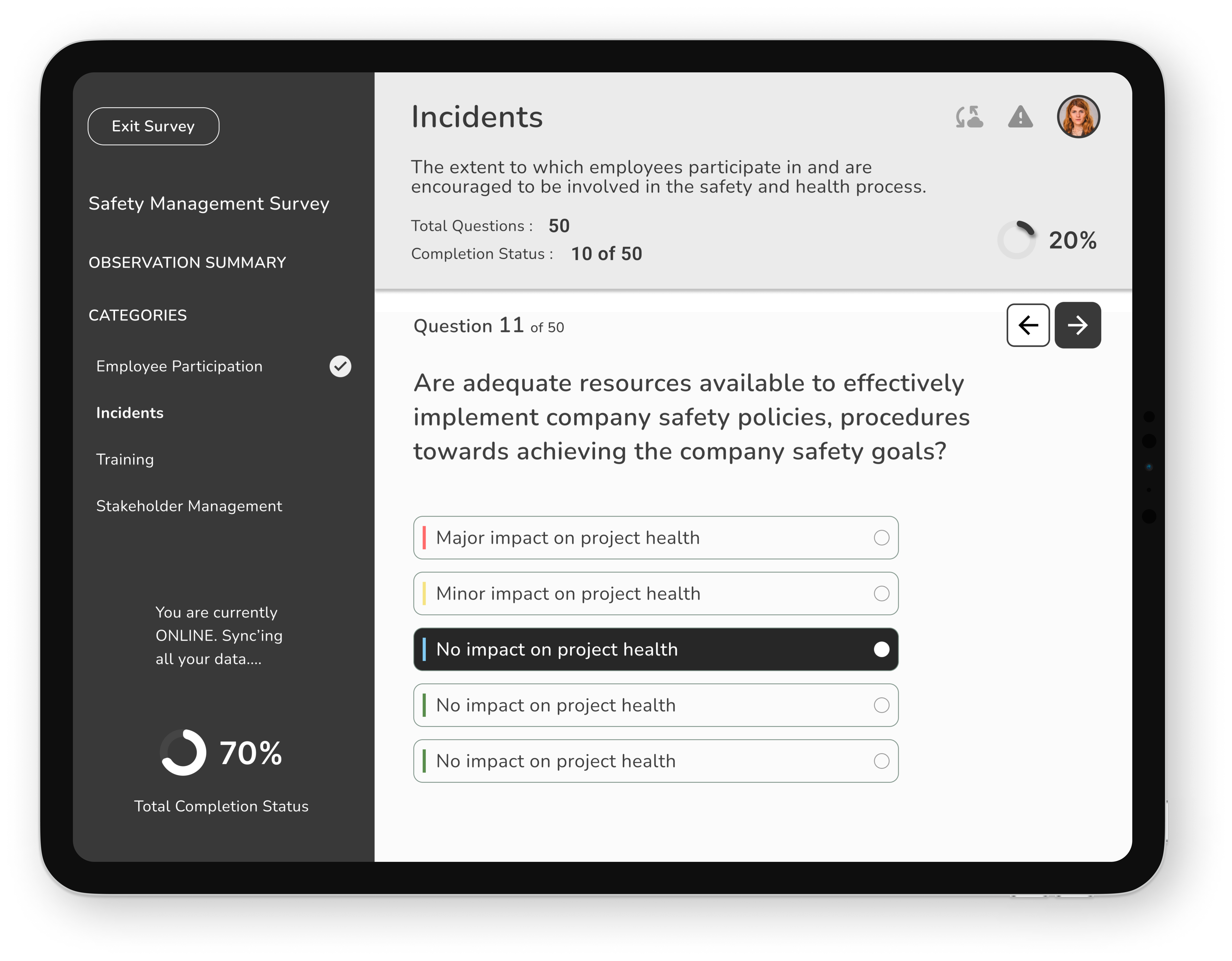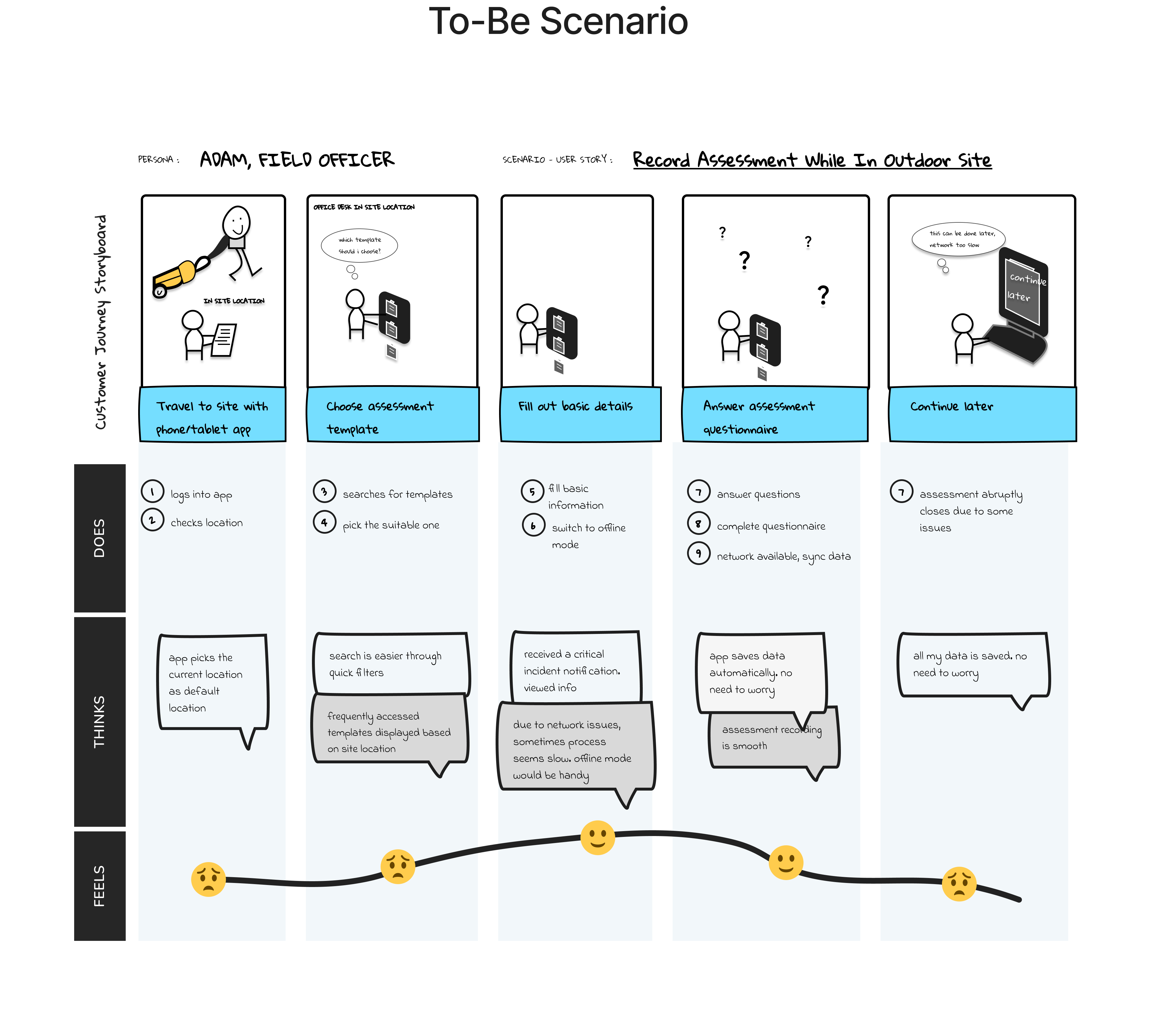 Continue later | Saves and exits | "Will this sync correctly?" | Worried | Reliable offline sync, confirmation |